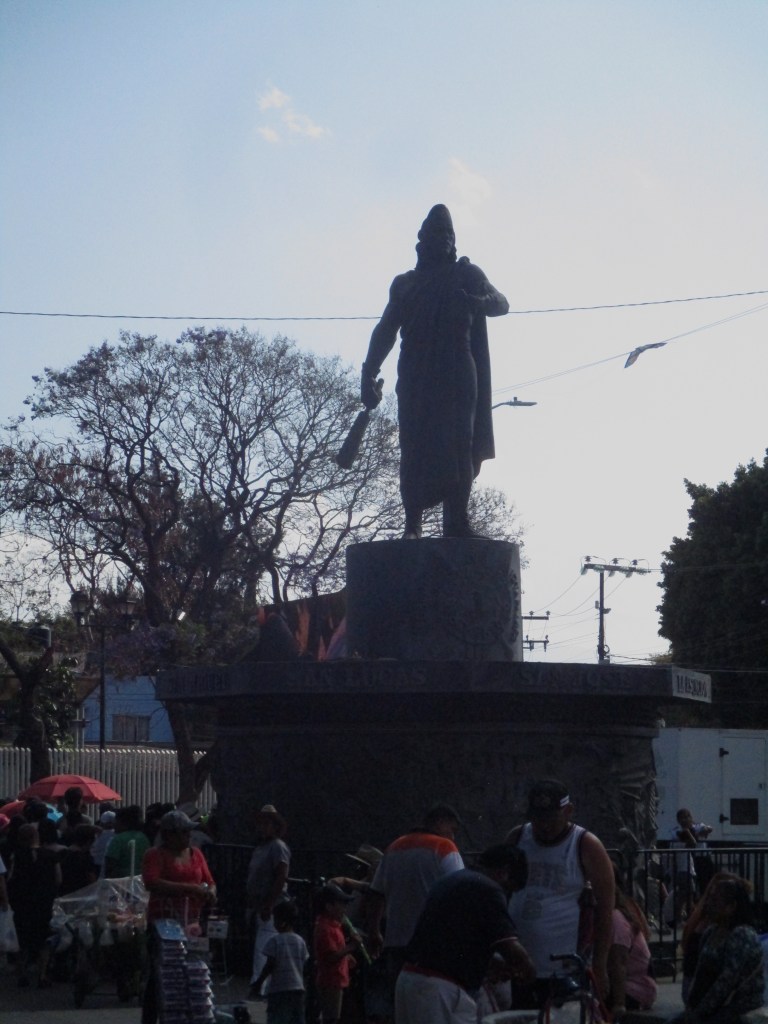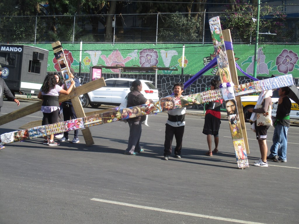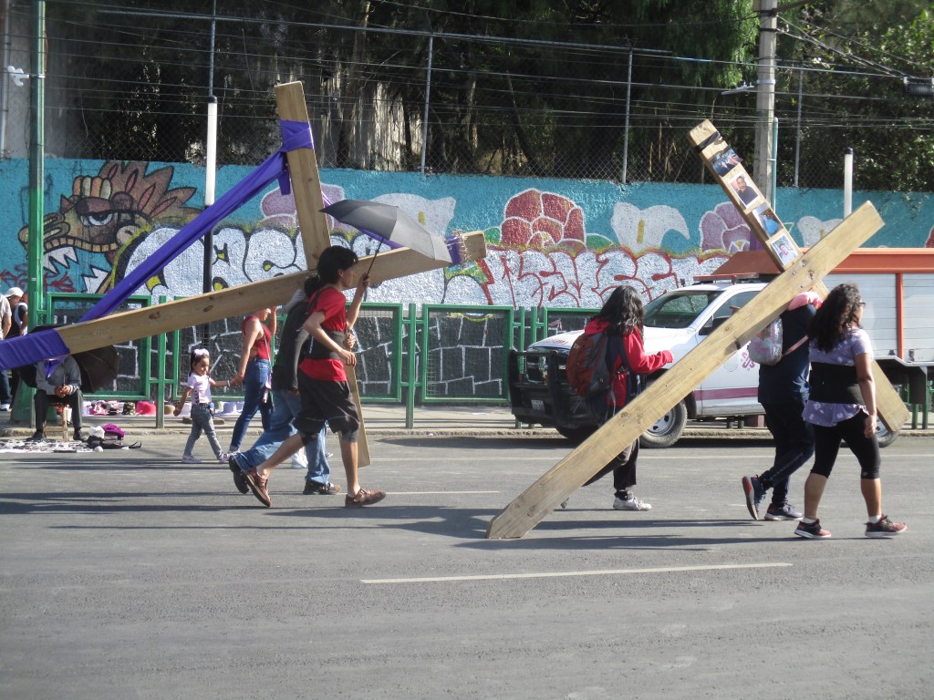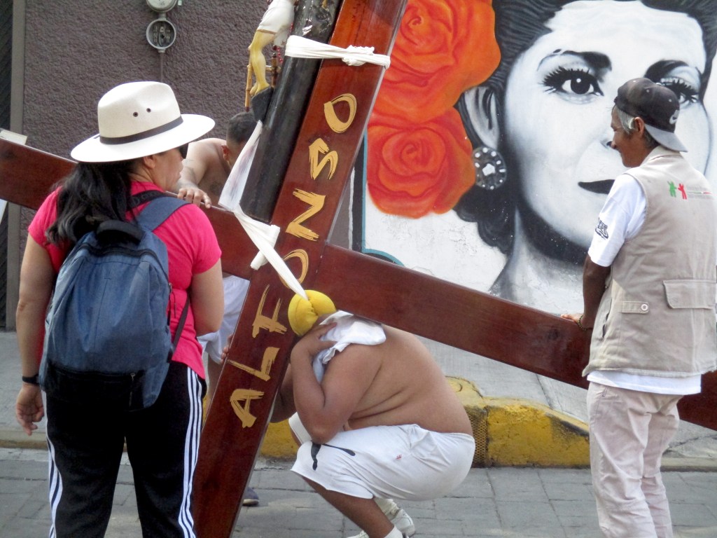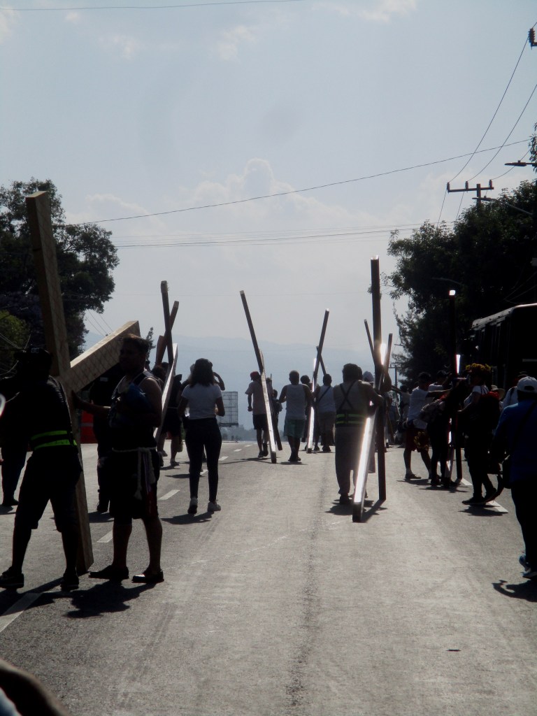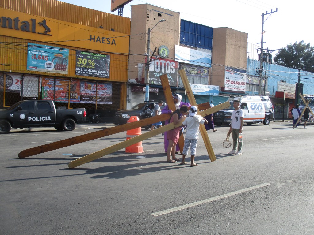 Me encuentro con el primer Jesús, no se llama así, pero carga una cruz parecida a la del personaje de esta historia fatal, carga su cruz de varios kilos, algunos familiares le miran, le esperan mientras recupera el aliento caliente dejado en el cerro. Llego hasta donde puedo, los policías formados ya no dejan pasar, aprovecho para comprarme una tostada de maíz quebrado, un par de niñxs gritan ¡agua, agua, agua!, personas aprovechan para vender algo en estos días, comida, refrescos, bolis, gomiboing. Sin sospecharlo un niño sale entre la multitud, y lo vi, lo vi, vi algo, vi la entrega, el sufrimiento, el esfuerzo, el niño caminando, la mirada fija en la comida vendida en las bicicletas, las tostadas de maíz quebrado azul untadas con frijol, nopales, queso, sal, y el niño disfrazando su piel morena con una tela morada, cargando una cruz de madera, rogaba con la mirada algo, algo de alimento, dos hombres detrás de él confiaban en su fortaleza, él también, bajó la mirada y caminó, caminó sobre avenida Ermita en una de sus partes más desgraciadas, otro Jesús.