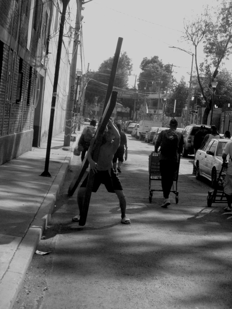 Y los Jesuses aparecían, bajaban del cerro en donde mucho antes de que el Señor de la Cuevita habitara esas tierras se celebraban rituales teotihuacanos. Hombres, sobre todo hombres cargando una cruz de madera, de distintos kilogramos, hombres con vestimenta ligera, sudando, de rostro firme, con la convicción de lograrlo, los tenis gastados, los huaraches, los pies descalzos, la sangre, el sudor, el encontrar una razón en el viernes para existir y cumplir, los nazarenos. No les quise preguntar sus motivos por pena, porque merecen no decirlo y seguir en su condena, en su manda bajo el supremo. Perdido seguí el rumbo de las pesadas cruces, entré de nuevo al centro de Iztapalapa, la mucha gente en las calles, la feria animando peligrosamente las salvajes ganas de marearse, luces, un poco de reguetón, lxs familiares esperando, tomando fotos de aquellxs que ríen y están al borde del vómito en un juego mecánico que huele a hierro y sostiene sus pesadas estructuras sobre trozos gruesos de madera.