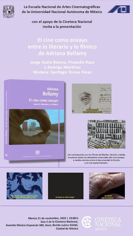 A ese reino pertenece la labor, disfrazada de académica, de Adriana Bellamy, y ahí, en medio de las butacas, está sembrado su libro El cine como ensayo, entre lo literario y lo fílmico (ENAC, UNAM, 2023), obra que se presenta a las 19 horas este 21 de noviembre en la sala 4, ArcadyBoytler, de la Cineteca Nacional del panteón de Xoco, de la que mostramos, a modo en entrevista, un adelanto para invitar a que se apersonen.