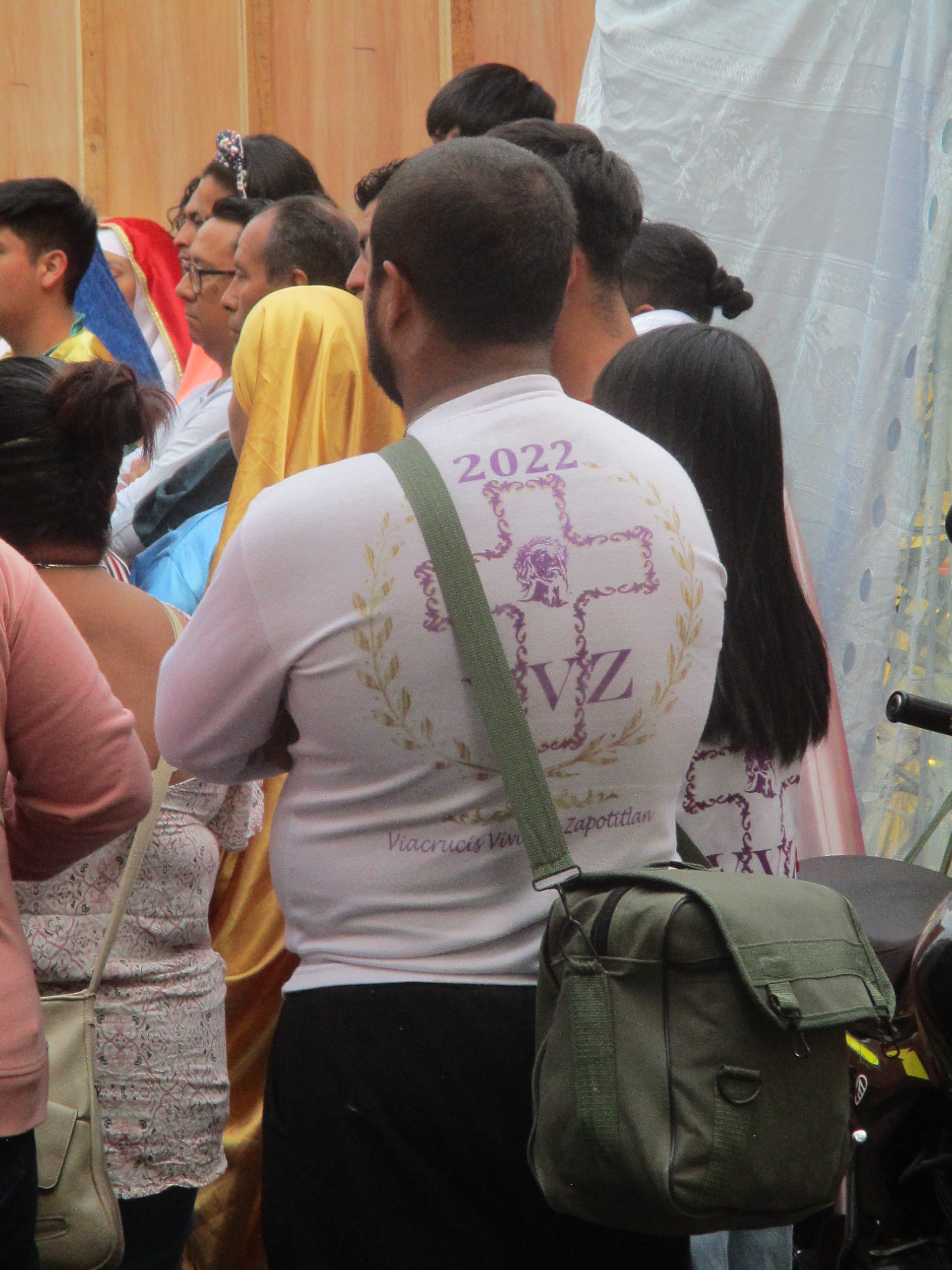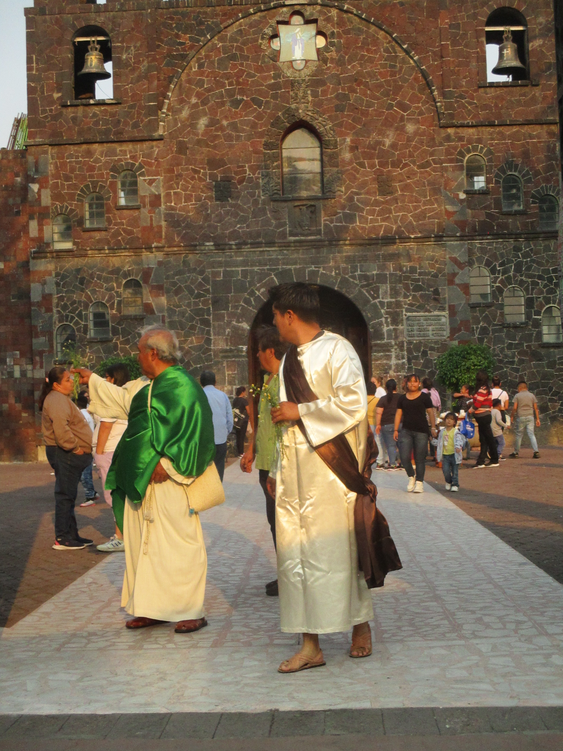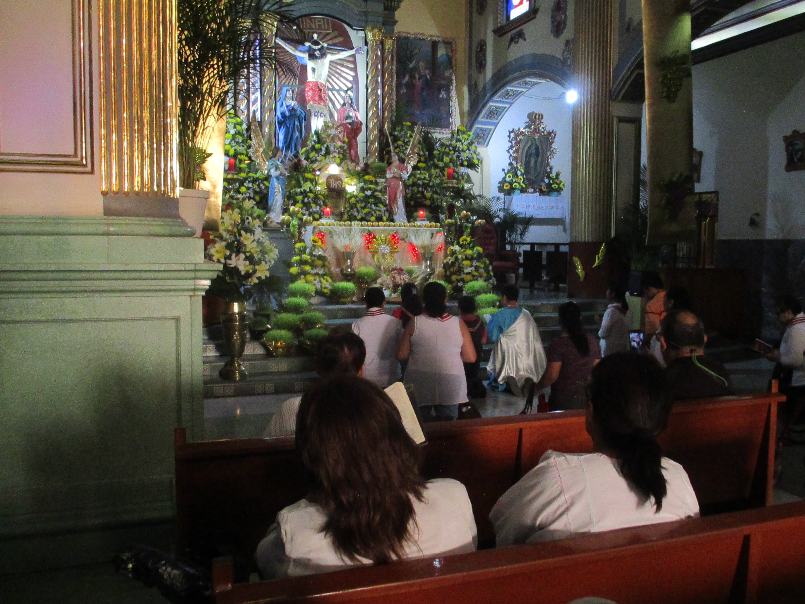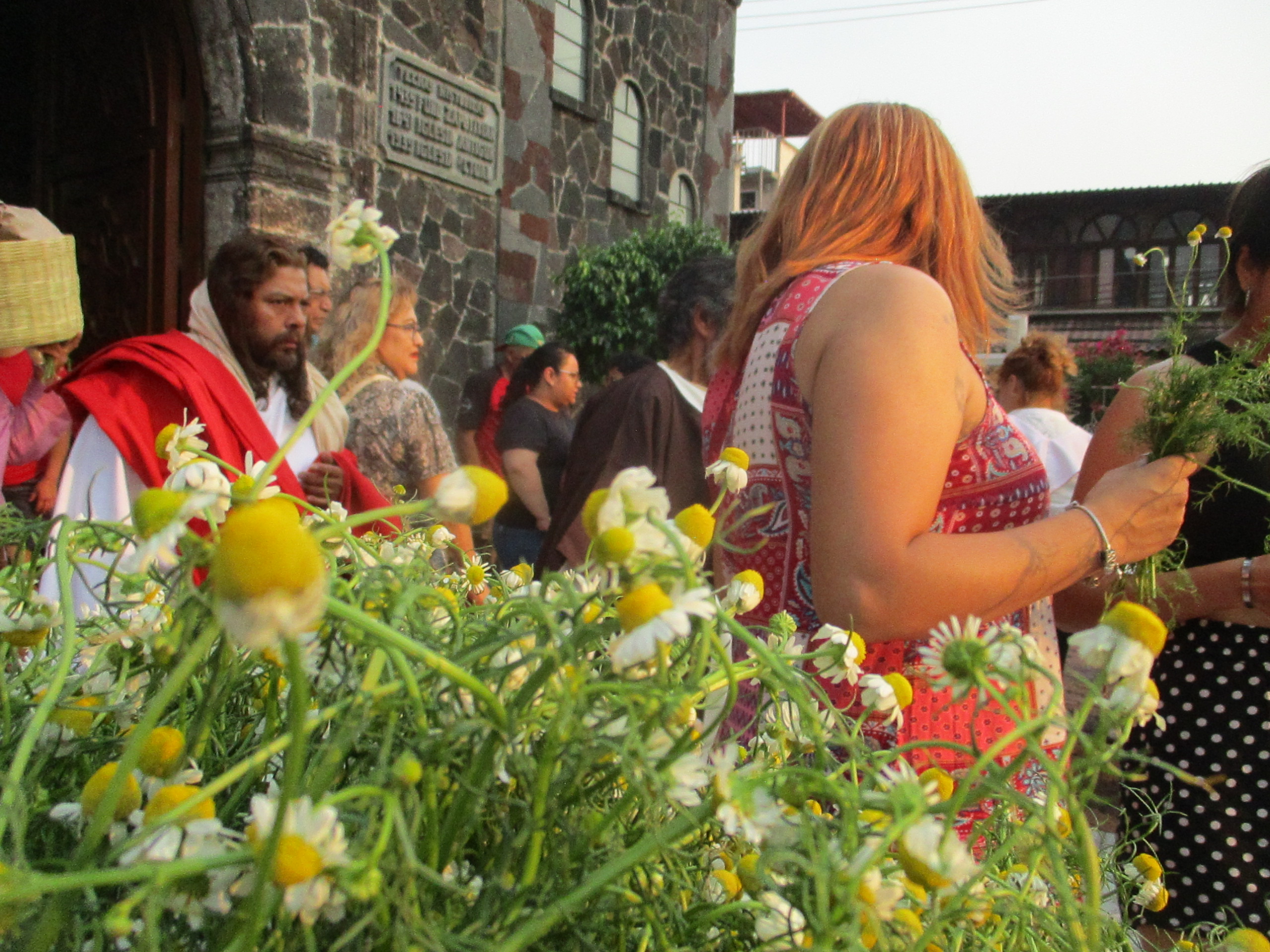 Debajo del árbol de inmaduros duraznos el grupo de personas católicas se preparan y se dan ánimos para la representación del viacrucis en la Plaza Juárez, de Santiago Zapotitlán, en Tlahuac. Los niños y las niñas juegan con las pelotas de plástico, con los juguetes que crean burbujas brillantes y momentáneas. Mujeres, hombres, caminan ante el sol que de a poco se esconde en un jueves en donde un hombre está por ser traicionado. En la iglesia las señoras regalaban manzanilla, pan, vendían veladoras para calmar ciertas culpas, ciertos dolores. Adentro, en el atrio, de rodillas, niñas, niños, mujeres, celebraban la misa, leían frente al micrófono algunos pasajes de la biblia.