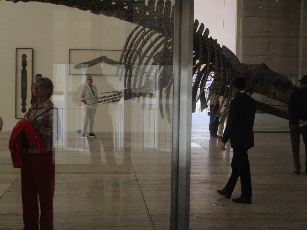 Pura risa, puro acá, las escaleras de miedo y bajando y cantando, en la vida pensamos que la gloria es el dinero, pero nos equivocamos nuestra gente es lo primero, #ánimo. El segundo piso nos aguarda con las peculiares obras destinadas a la observación de lo etéreo, de lo natural. Huellas de hojas entintadas colgadas de un lazo, trazos de Gabriel Orozco sobre una hoja con un escupitajo de pasta de dientes, restos de lo humano, restos de la vida en esa bola que rodó y rodó en las calles para impregnarse de mugre y vivencias. Pequeñas provocaciones: la capa de una cebolla, vienen a mi memoria también las fotos del perro echado, la pequeña Ciudad hecha de basura frente a una Ciudad hecha de rascacielos, smog y turbias manías. Y está la Caja de zapatos vacía, a un lado dos guardias cuidándola, la verdadera obra, el descaro en la sala, la posibilidad de transgredir objetos y espacios, de simplificar conceptos y dejarlos sin tapa. Obras pequeñas, algunos trazos reflejo de algún tiempo. Cráneos y barro, formas primitivas en donde se conserva, un corazón, unas manos, las huellas de alguien. Procesos de una búsqueda que se considera azarosa, no sé si gozosa, pero al menos se mira divertida. Tal vez cuestiona algún mal de nuestro presente, o juega con las representaciones y símbolos de lxs seres humanxs, de la sociedad, para provocar, conmover y hacer conversación, para crear en un mundo atiborrado de objetos, de muchos y variados. De cuadro en cuadro, trazo y objeto, avanzamos a la sala más luminosa, que se rodea de una zona ejecutiva de la Ciudad, deslumbran los vidrios de los edificios. El guardia responde nuestro saludo y nos indica el recorrido, entramos a la pecera en donde la muerte se configura en tatuajes y tiempo de huesos. La reproducción de la osamenta de una ballena sorprende al ojo, invita a curiosear en los trazos de lápiz que tanto atraen a Gabriel Orozco. Nos tomamos fotos con la obra, reímos, le damos un par de vueltas y nos encontramos con los balones, un montón, un sujeto acomoda uno que antes había pateado, me dan ganas de hacer lo mismo pero los guardias deben estar hartos de este tipo de iniciativas.